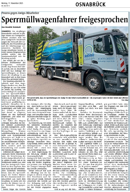 Während der Kläger im Zivilprozess Recht bekommen hatte, die Versicherung der beiden Awigo-Mitarbeiter also zahlen musste, sah es im Strafprozess anders aus. Hier kam das Amtsgericht Osnabrück zu dem Ergebnis, dass man nicht mit der erforderlichen Sicherheit feststellen könne, dass der Sperrmüllwagen der beiden Männer für den Zusammenstoß verantwortlich war. Nach dem Grundsatz In dubio pro reo wurden die Männer von allen Vorwürfen freigesprochen.
